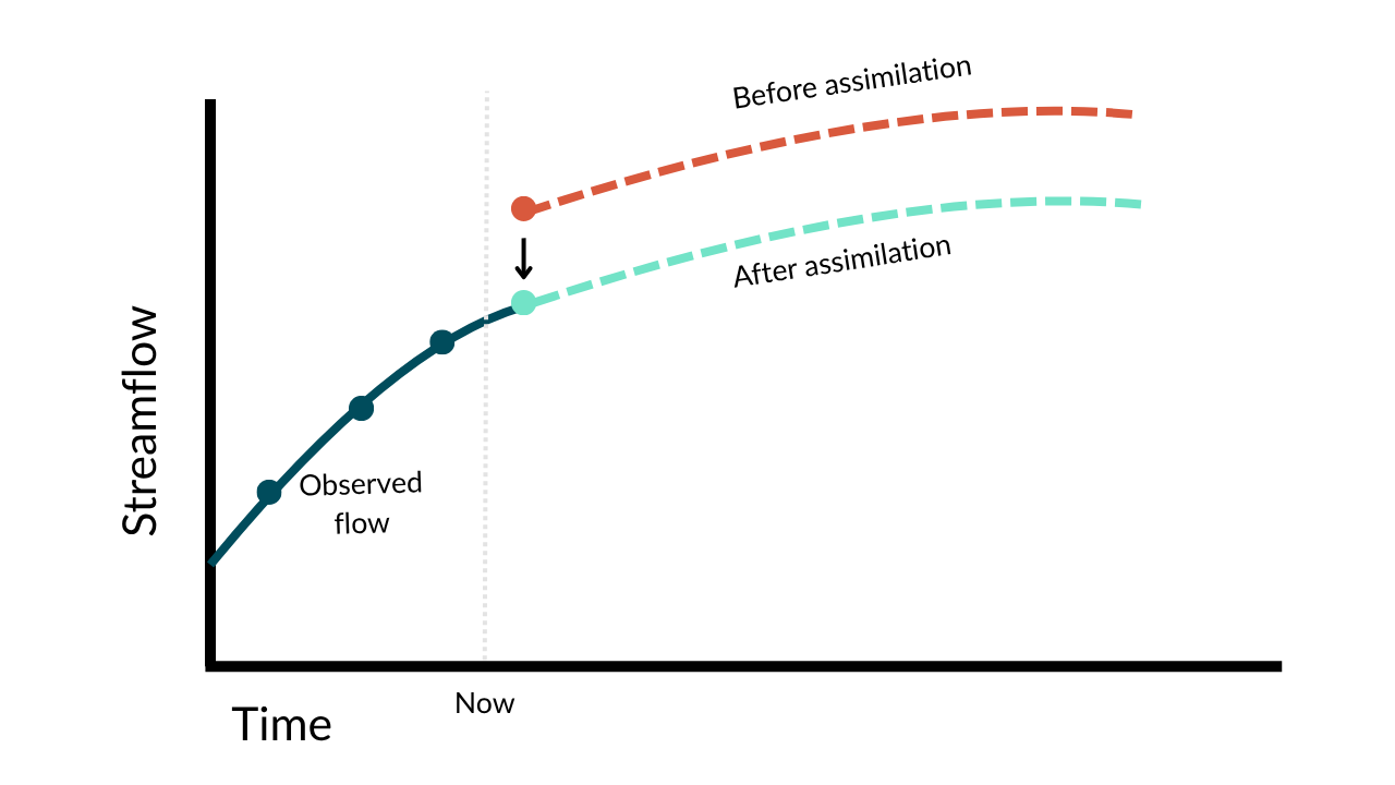 Assimilation improves the accuracy and responsiveness of streamflow forecasts, especially in the near term. When forecasts are updated frequently with observed data, they’re more likely to reflect recent changes on the ground—making them more actionable for operations and planning. This is especially helpful for capturing sharp changes in flow, like sudden runoff.